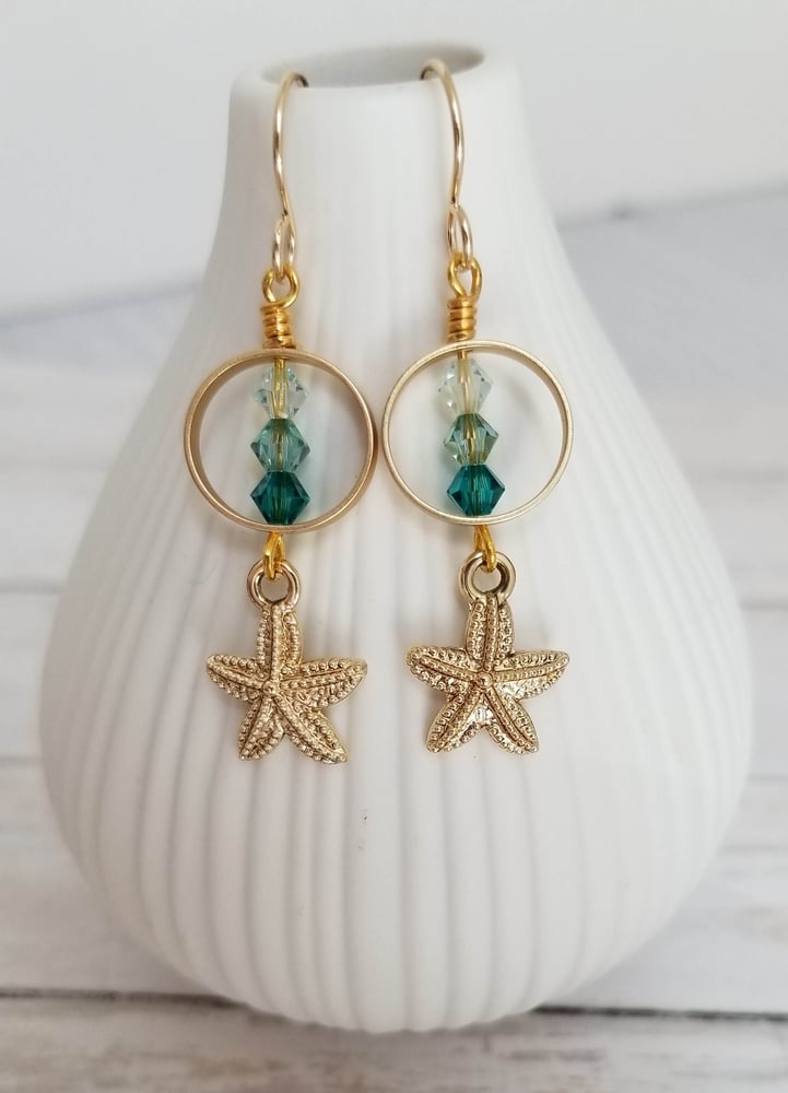 Gold Starfish Earrings Beach Inspired Jewelry Rhinestone Starfish Dangle Earrings Beachy Jewelry Beach Lovers Gift