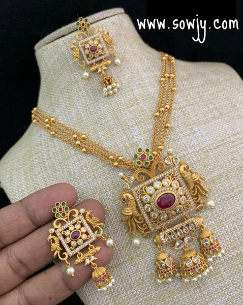 Trendy Ad Ruby And Emerald Stone Dual Peacock Designer Pendant With Designer Matching Earrings In Gold Long Chain