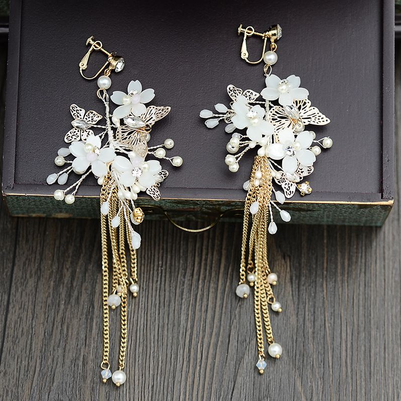Fairy Luxury Pink White Floral Butterfly Drop Earrings With Gold Tassles Bridal Wedding Evening Prom Party Ear Decoration Jewelry Earrings Custom