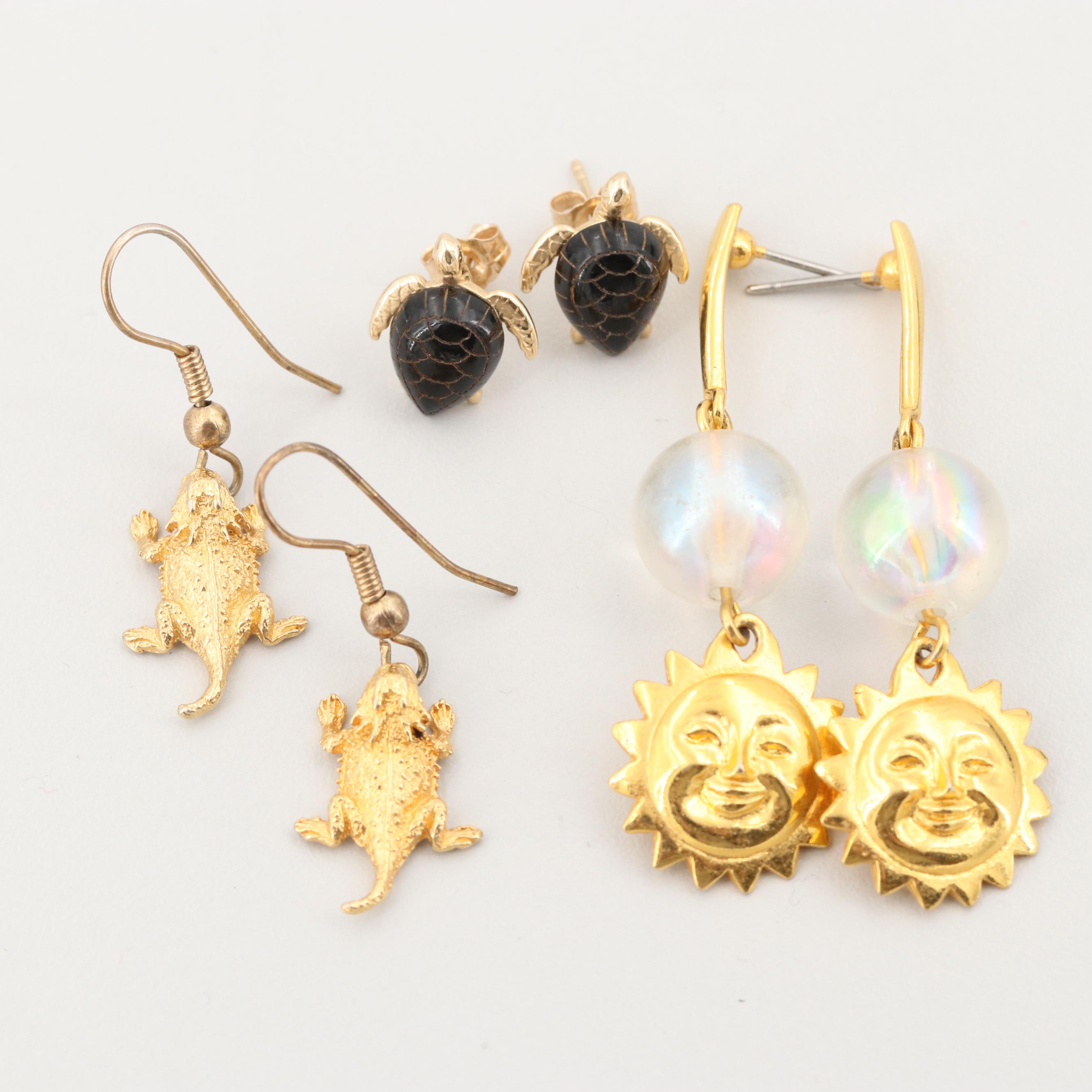 14k Gold Coral Carved Turtle Stud Earrings With Costume Resin Dangle Earrings
