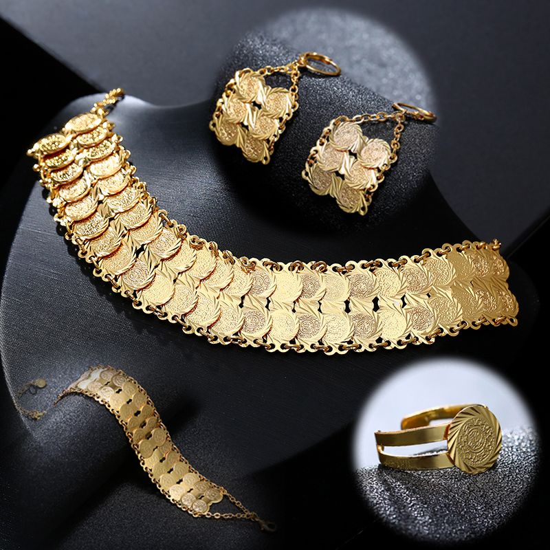 Exquisite Fashion Middle East Arab Bride Muslim Coin Necklace Earring Ring Bracelet Set Gold Color Wedding Jewelry Accessories Gold Wedding Jewelry