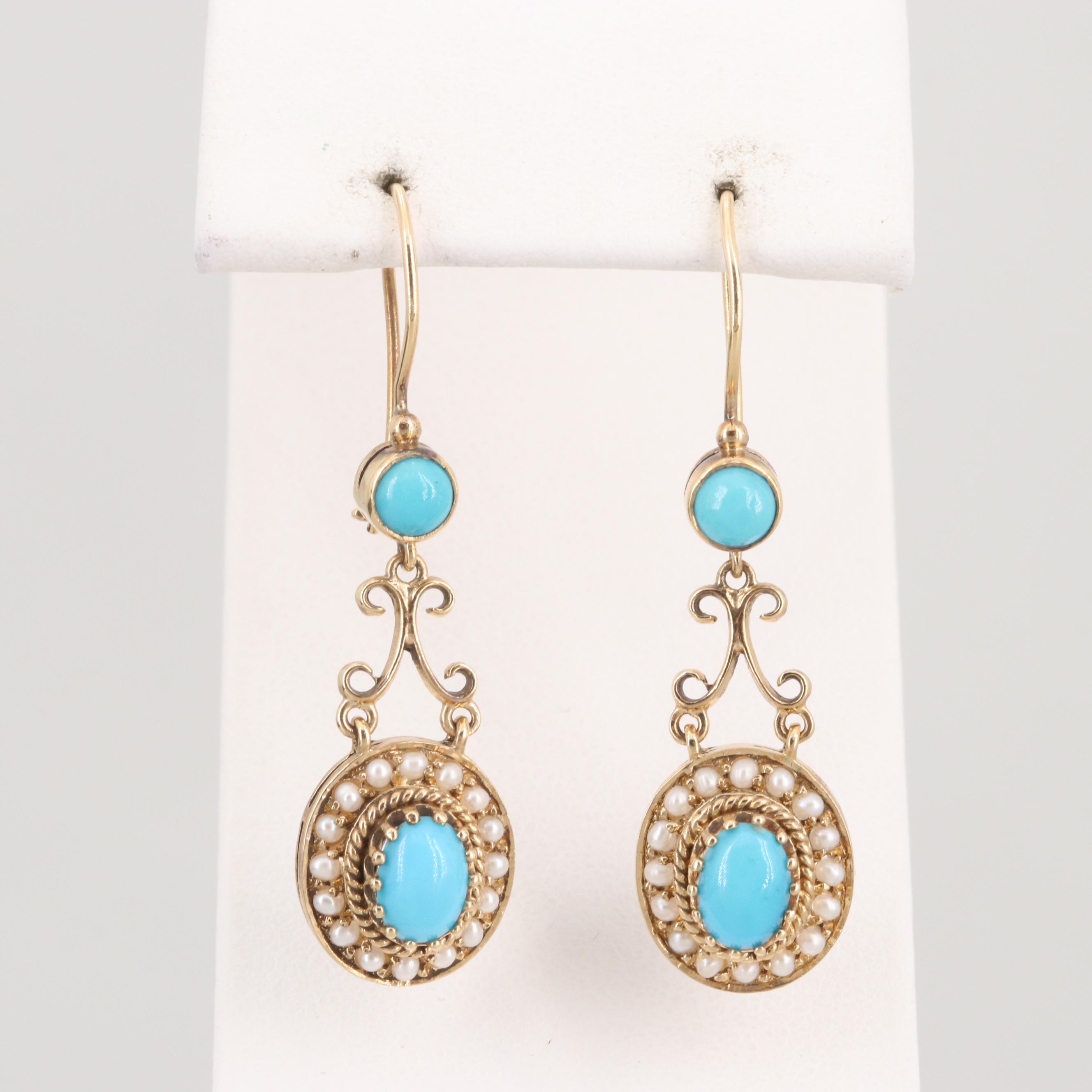 14k Yellow Gold Turquoise And Seed Pearl Dangle Drop Earrings