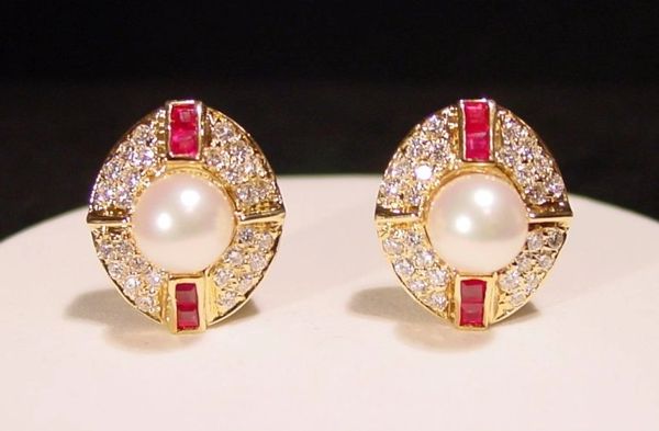 18 Karat Yellow Gold Ruby Diamond And Akoya Pearl Earrings