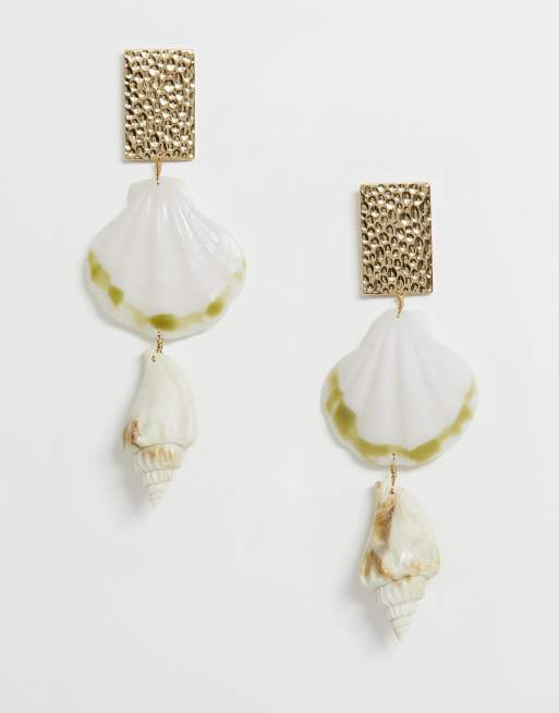 Asos Design Earrings With Square Stud And Faux Shell Drops In Gold Tone