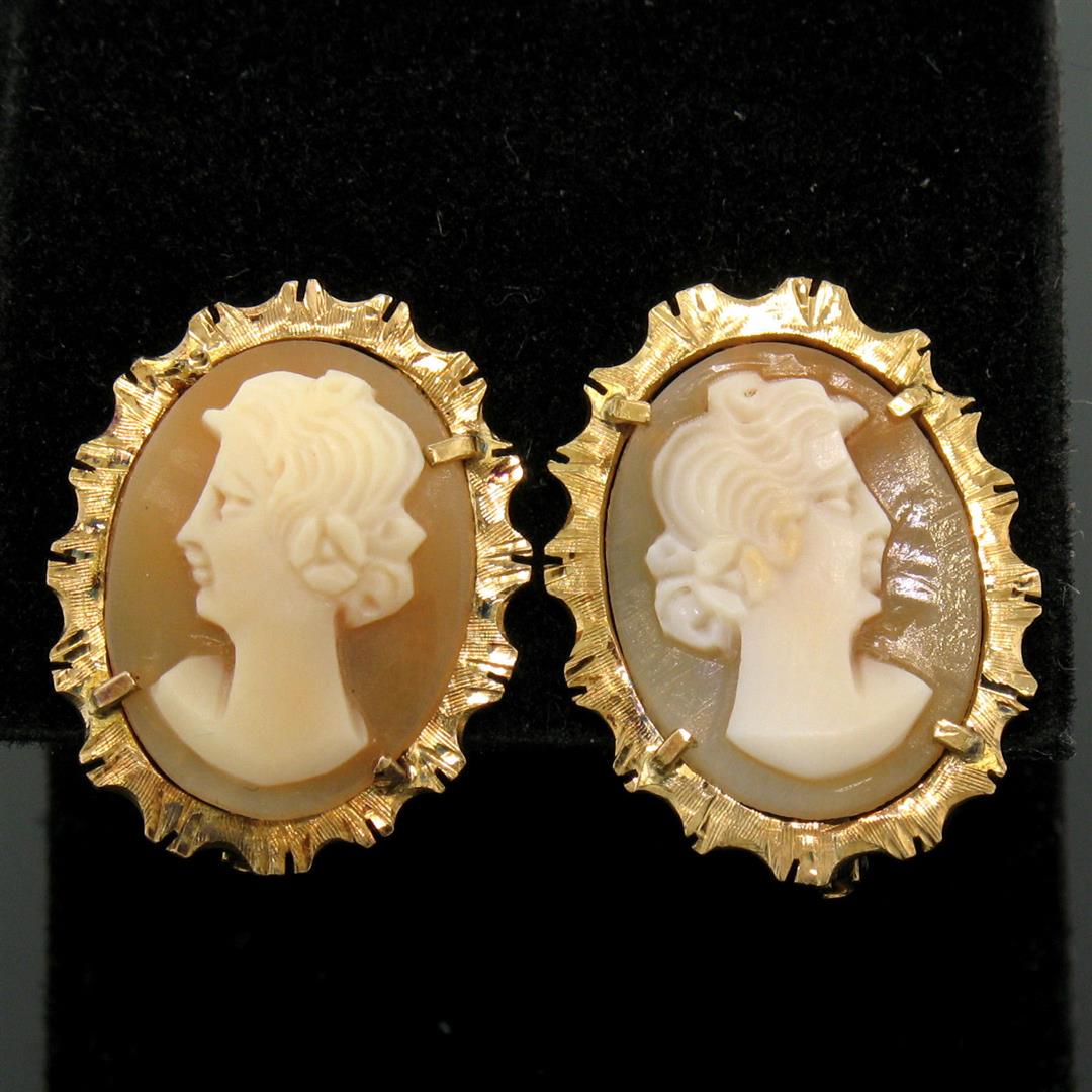 18k Yellow Gold Carved Shell Cameo Earrings W Etched