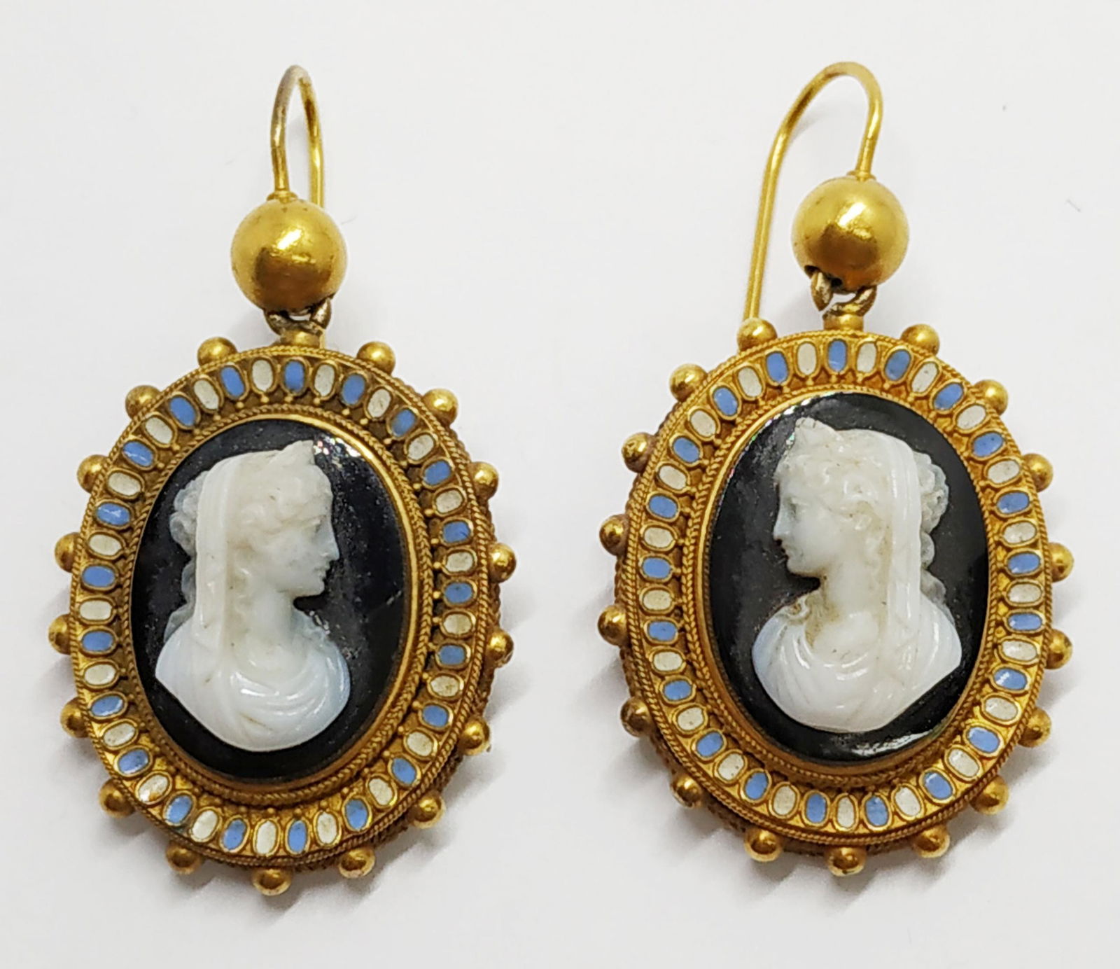 Pair Of 16k Gold And Enamel Cameo Earrings Italy 1870