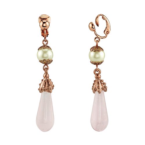 1928 Rose Gold Tone Simulated Pearl Rose Quartz Clip On Drop Earrings