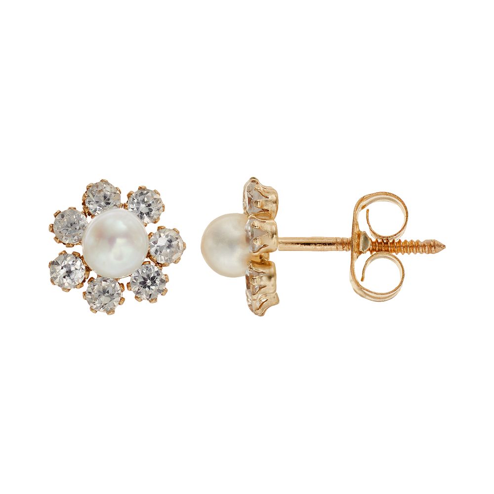 Charming Girl Freshwater Cultured Pearl 14k Gold Flower Stud Earrings Made With Swarovski Cubic Zirconia Kids